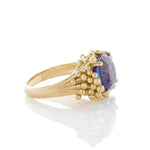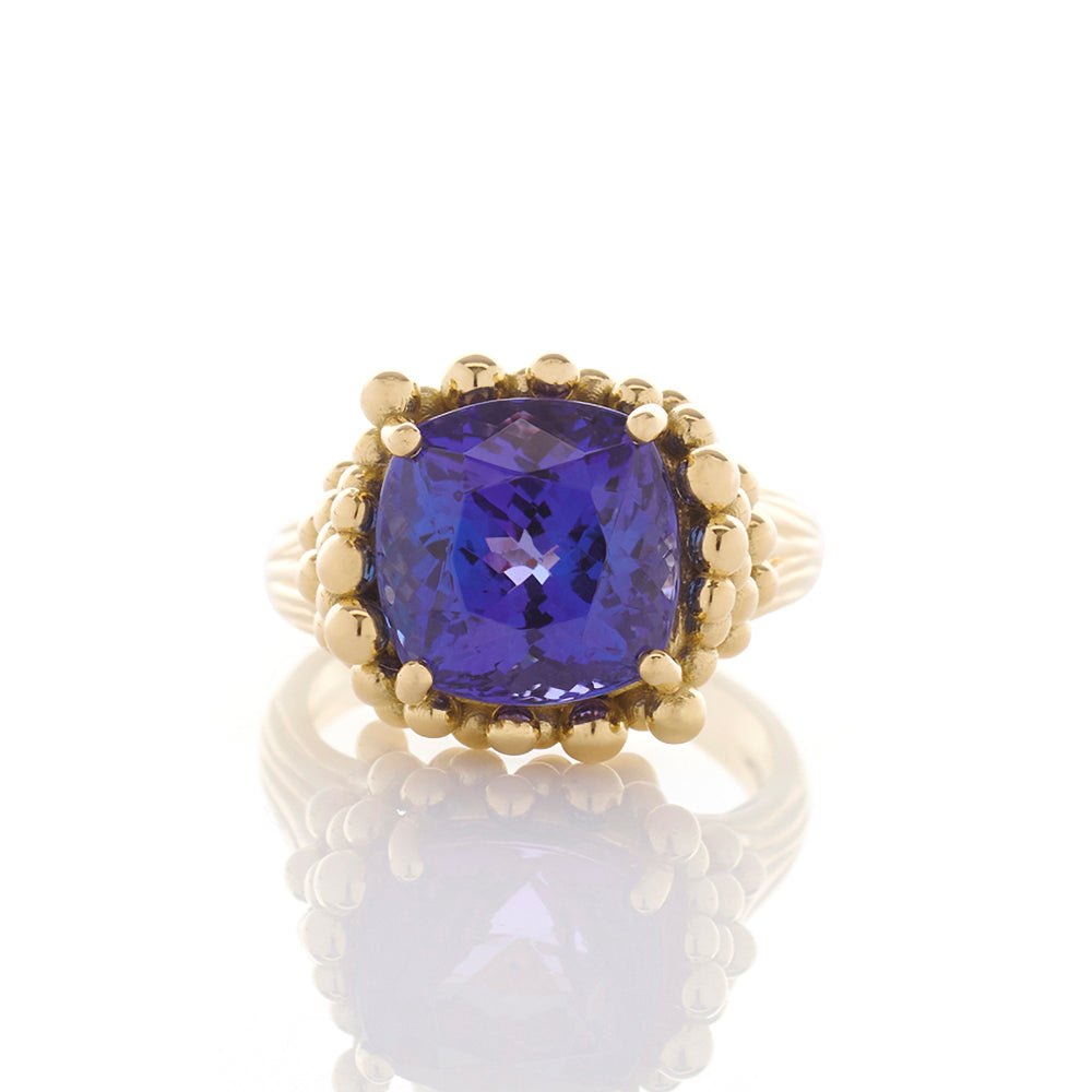 A rich tanzanite held by a cluster of golden molecules. Size M1/2