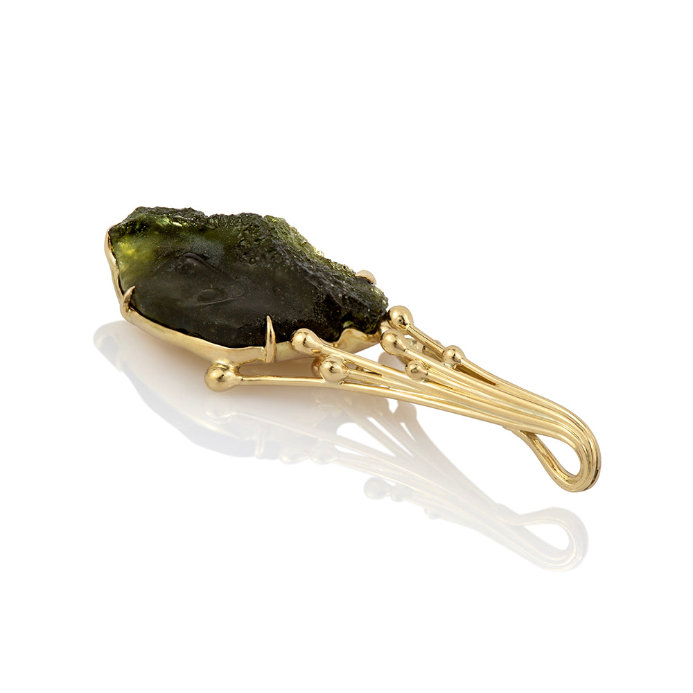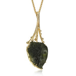 A fluid linear setting was crafted to complement this intricately carved face pendant. Its smooth, sculpted framework was meticulously handcrafted layer by layers, to highlight the stunning organic beauty of the moldavite stone.