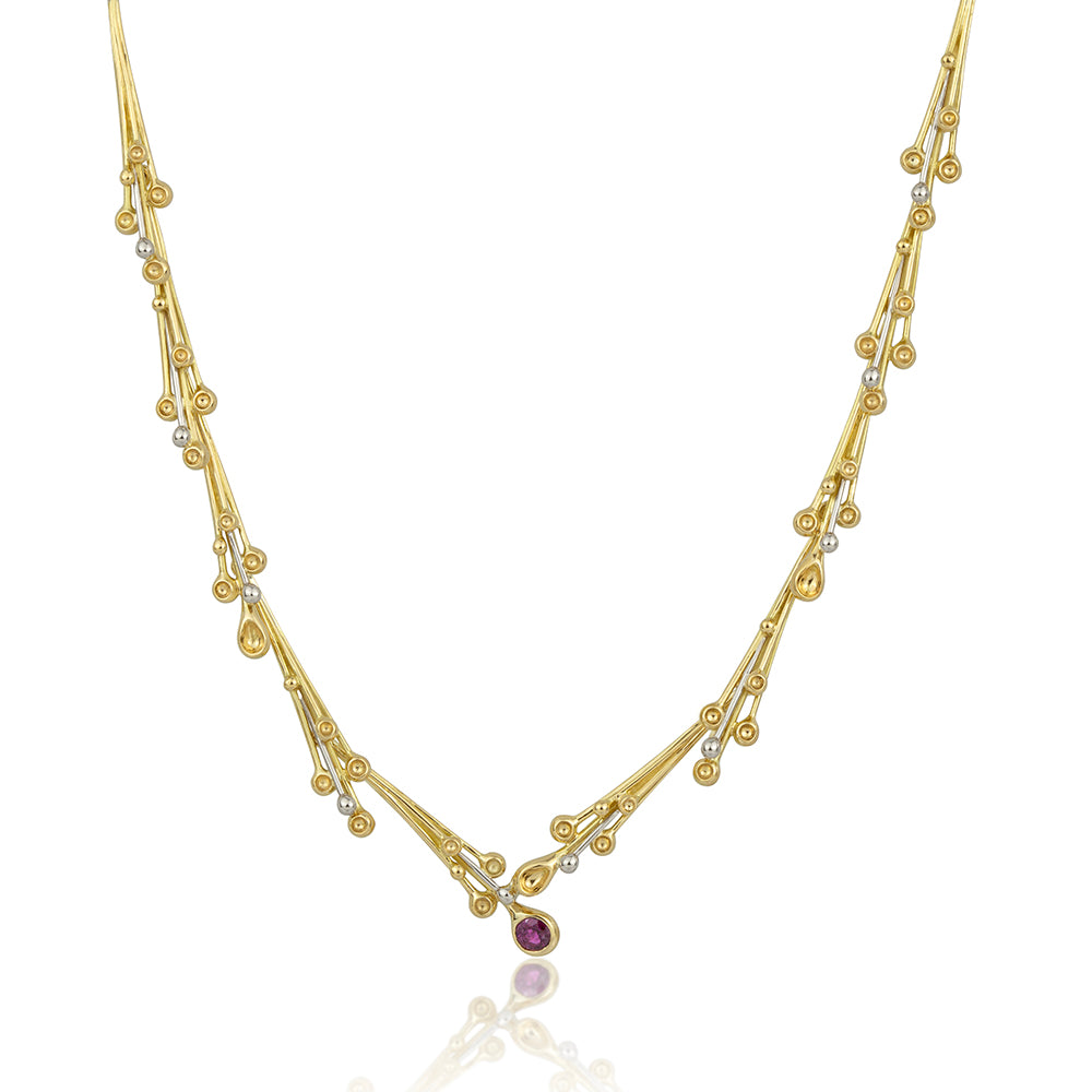 A blend of two tones of precious metal, showcasing a bold and elegant ruby setting. The necklace sits eloquently around the neckline.