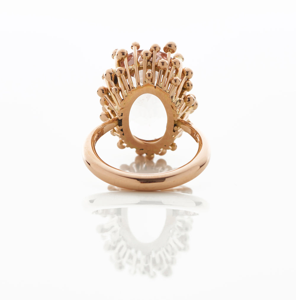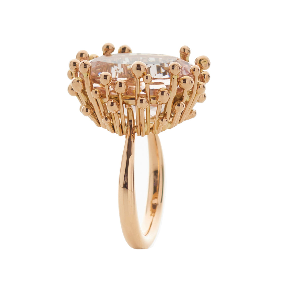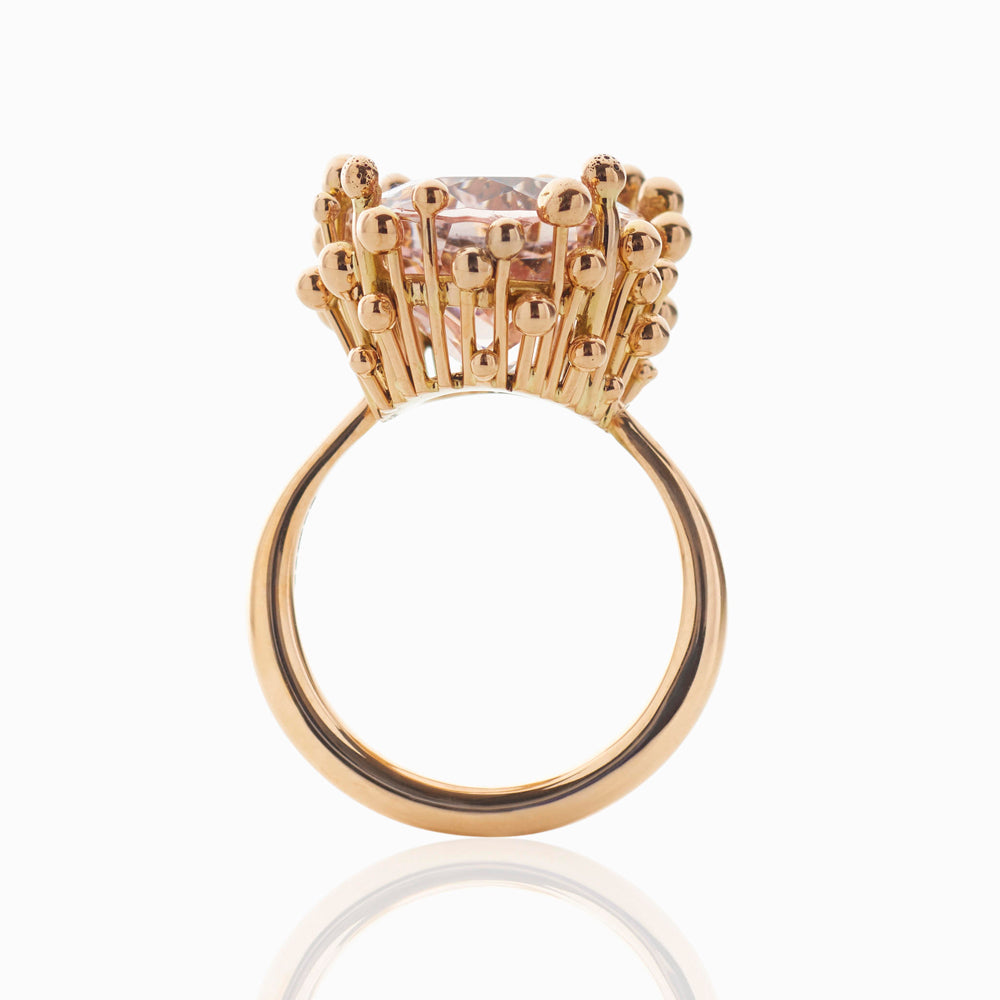 This ring was commissioned to celebrate a special anniversary. Rose gold Molecule stems sweep upwards to cradle this magnificent Morganite gem. Every element of this piece has been handcrafted to create the elegant and dynamic effect.