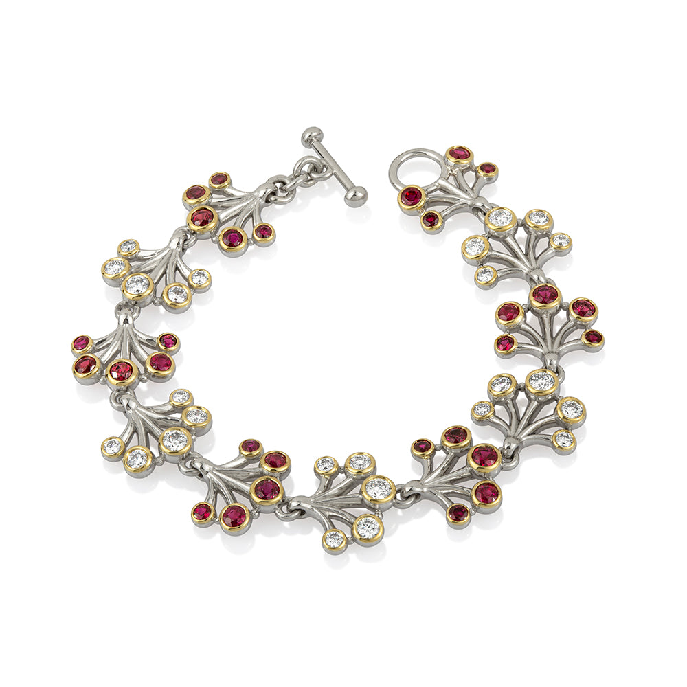 This striking Platinum bracelet was commissioned to celebrate 40 years of partnership, connection, and the raising of a family. Each stem represents a member of the family, rubies and diamonds are framed in 18ct yellow gold, to enhance the energy and colour of this stunning piece.