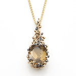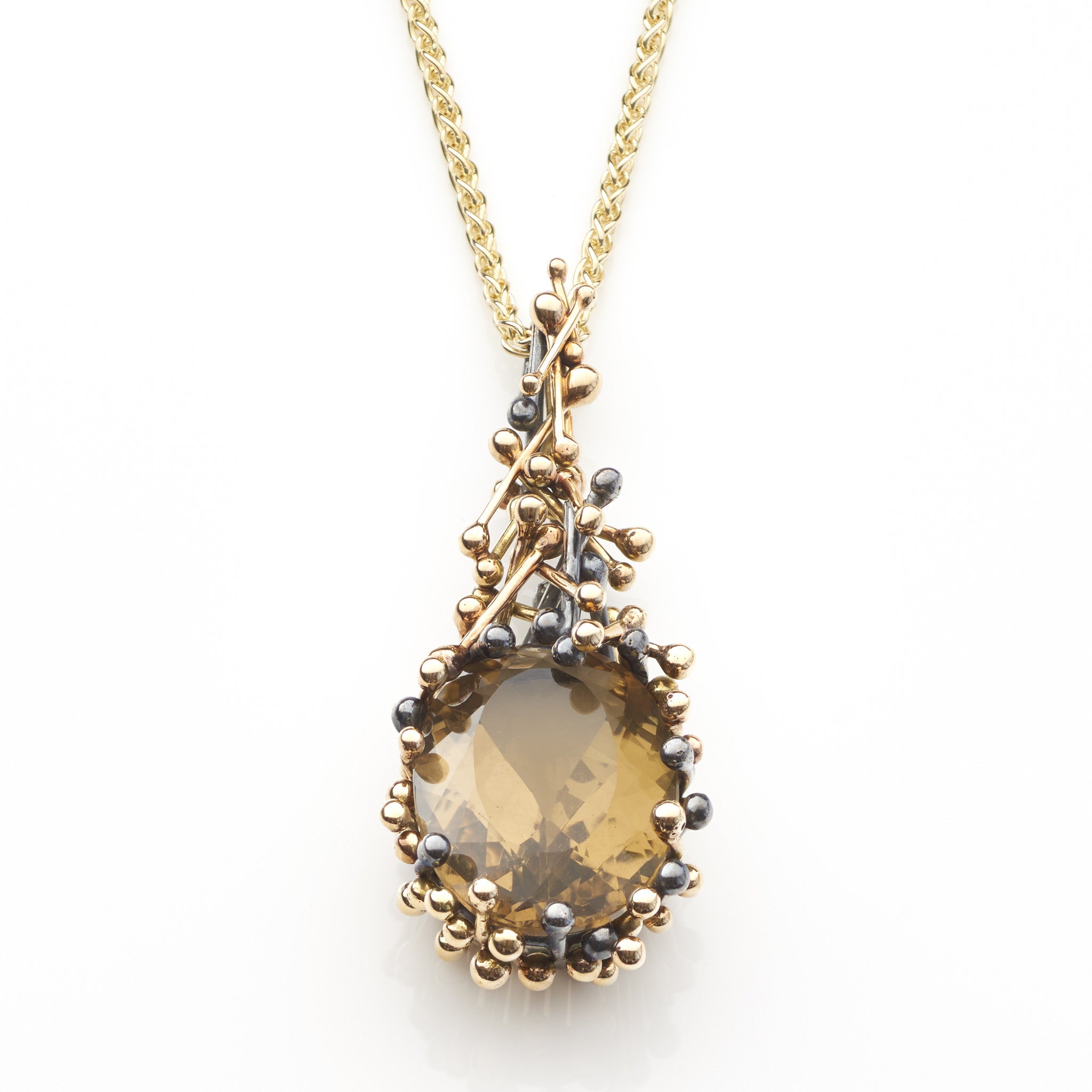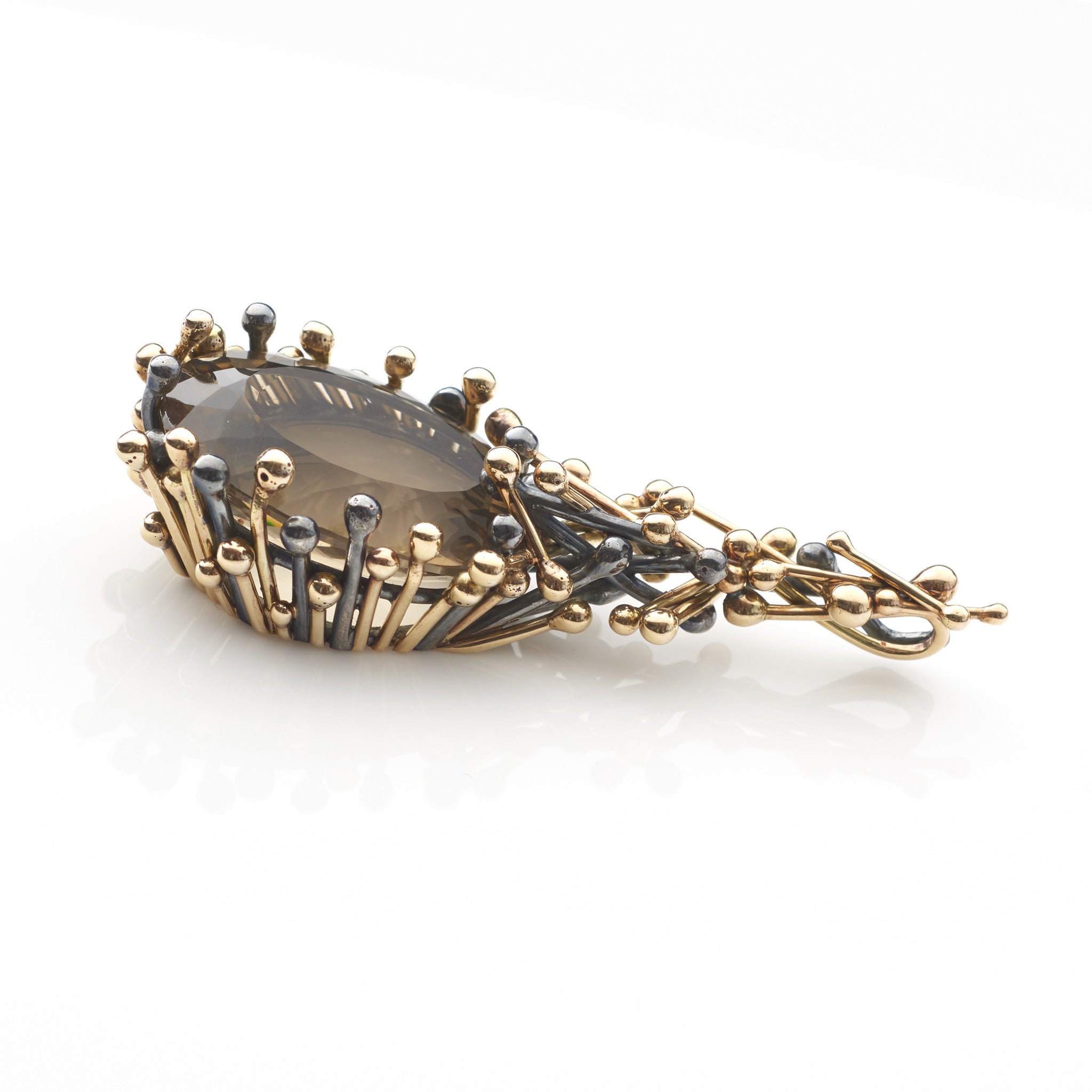 This sculptural pendant features a beautiful large smoky quartz encased in contrasting 9ct gold and oxidised silver molecules.