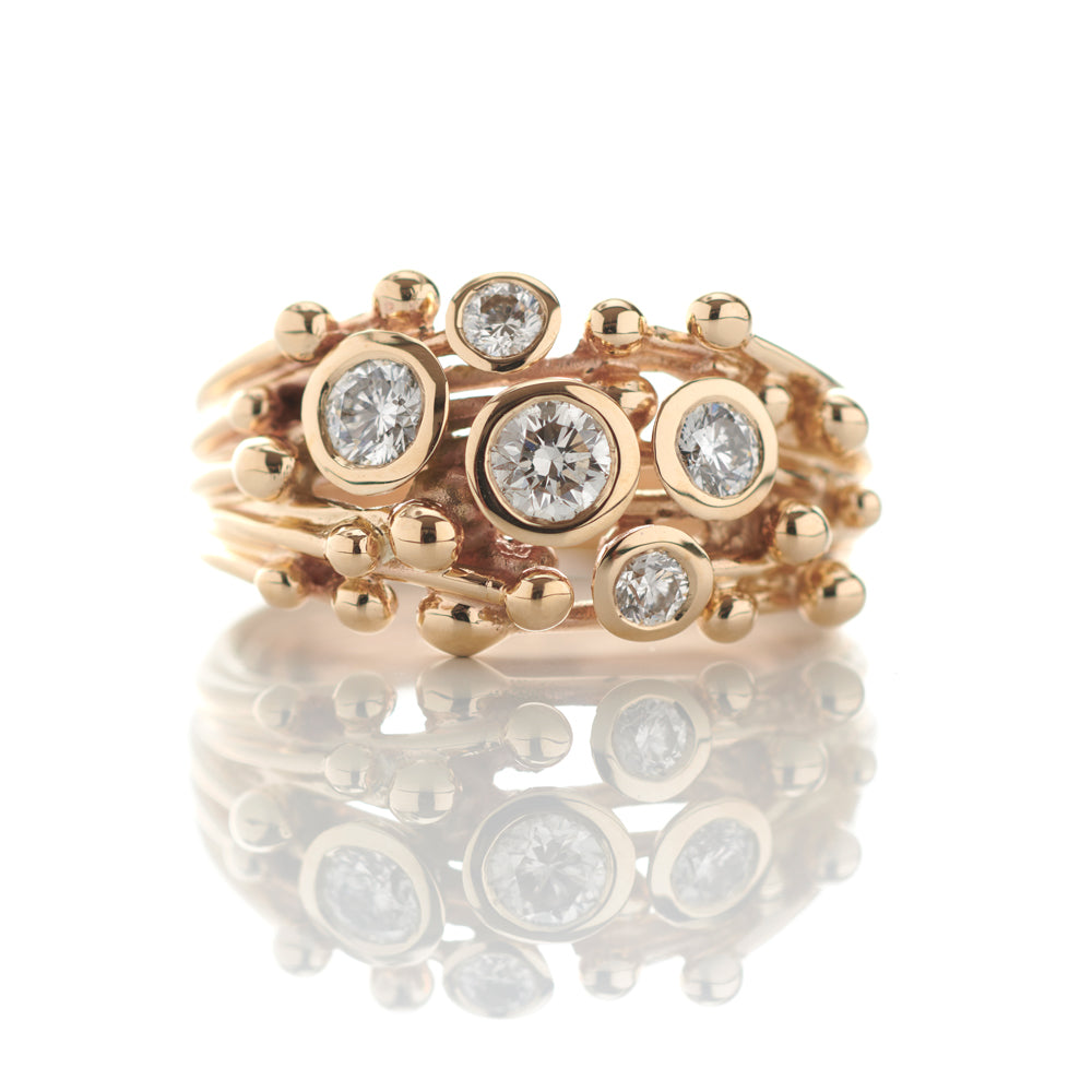A bold multi strand diamond ring with dynamic structural form. The ring has varying size diamonds, asymmetrically set and handcrafted.