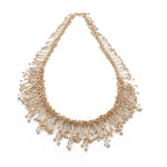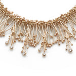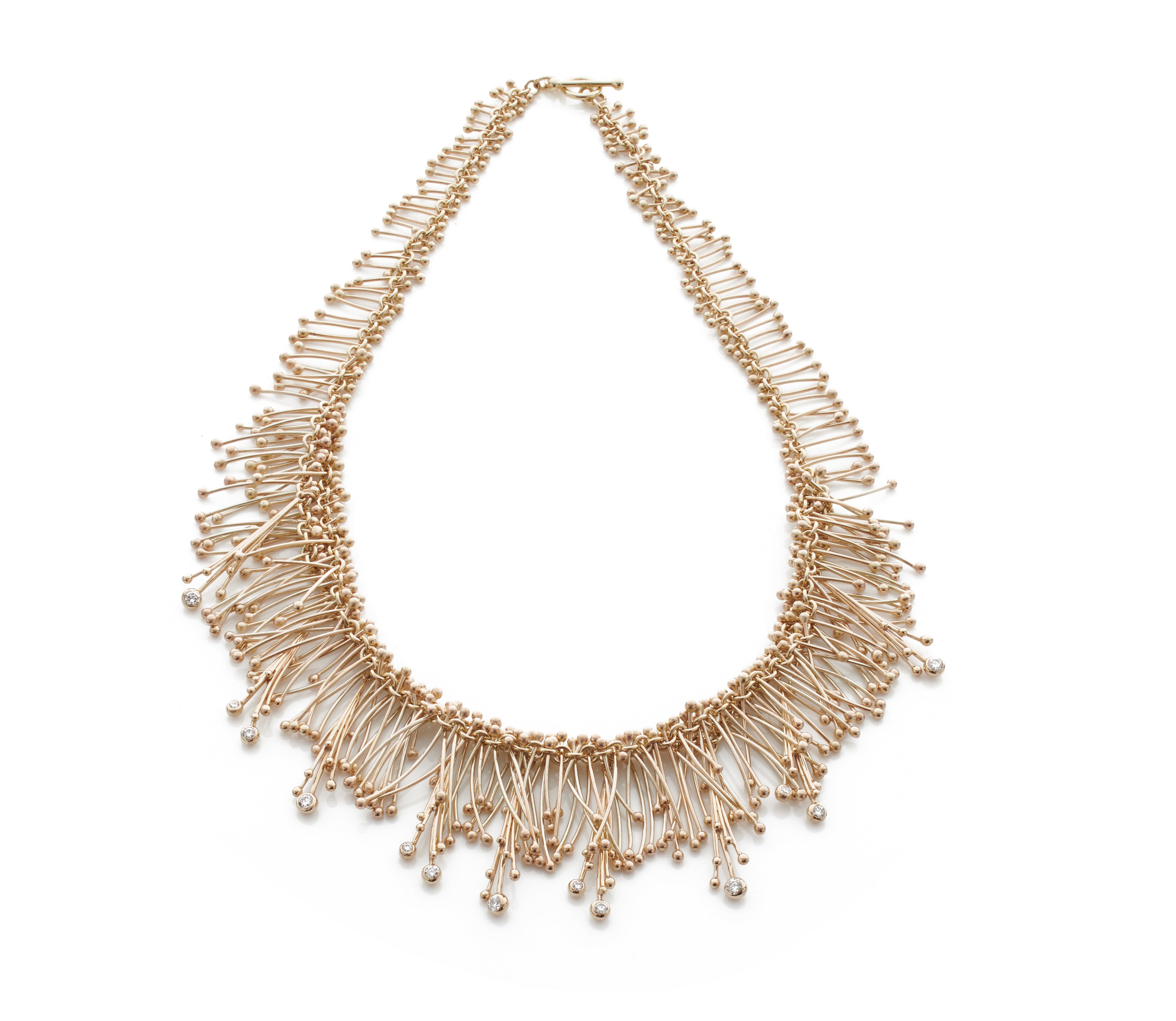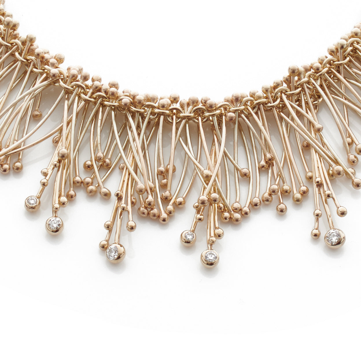 This new tactile gold and diamond necklace combines soft movement and fluidity with structured stems and golden strands set with diamonds. It comes alive when it's worn - every gentle movement sending out sparkles from the diamonds.