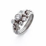 An elegant ring with depth and dynamic structural form which can be enjoyed from all angles. The piece has varying size diamonds set in a swirl of 18ct white gold molecule stems.