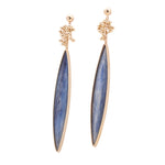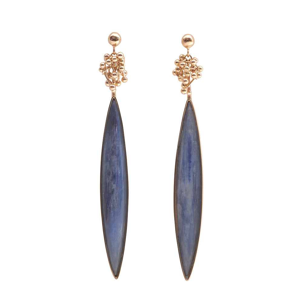 These Kyanite earrings exhibit intense shades of blue, with its multiple shades of colour zoning and streaks of white providing an interesting canvas to draw the eye. In this design, the myriad of colours and textures of the molecules combine to create a captivating design that is a unique combination of materials and structure.