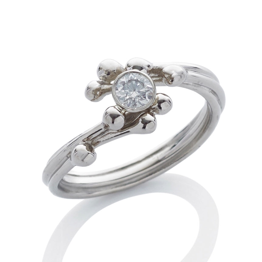 An elegant white gold diamond solitaire ring with a sweep of mesmerising molecule flow encasing a diamond.