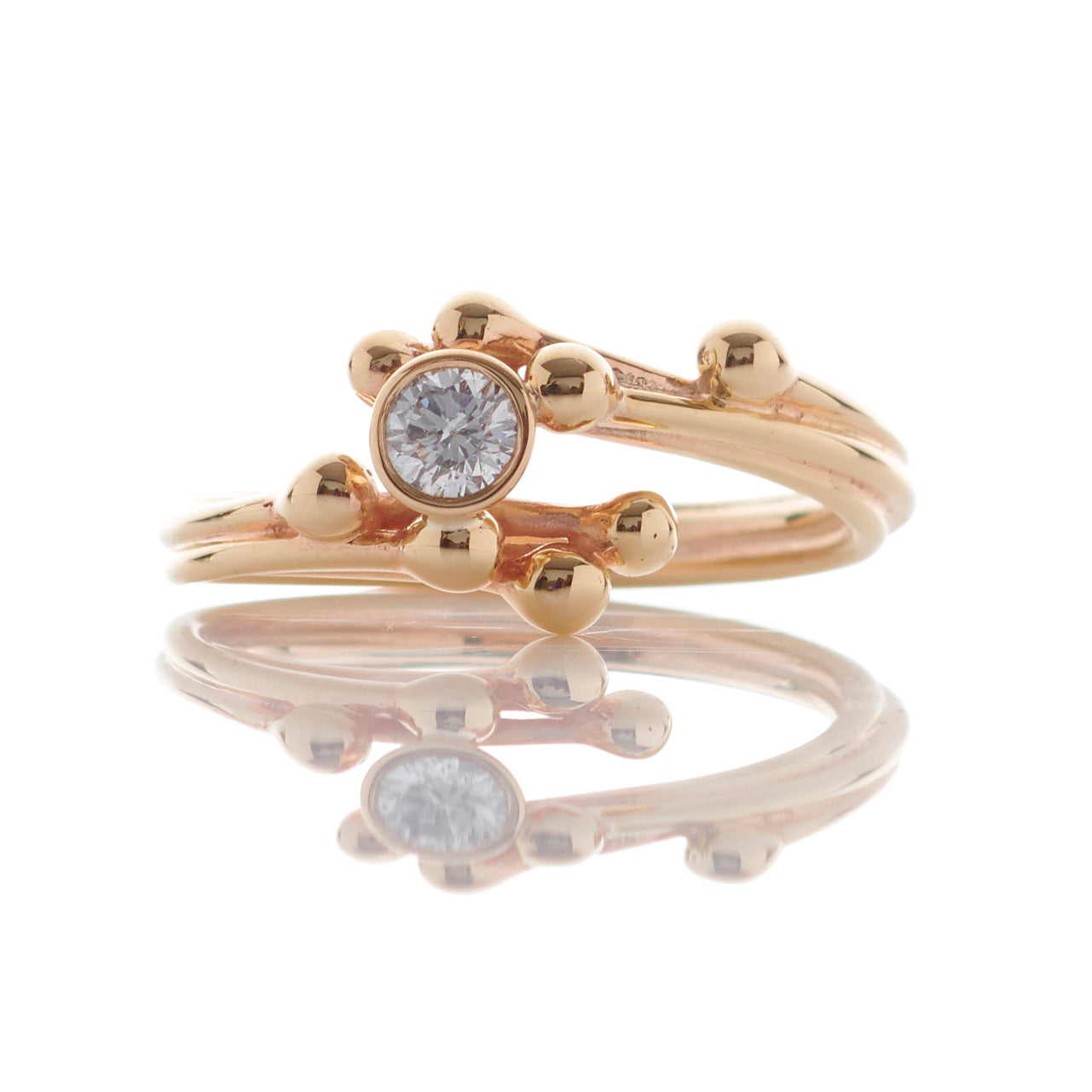 A yellow gold diamond solitaire ring with a sweep of mesmerising molecule flow encasing a diamond.