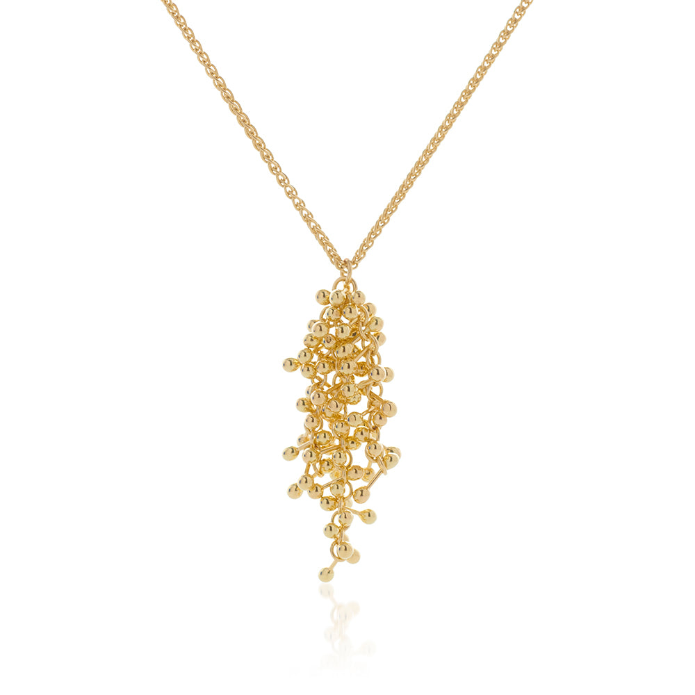 Intricate molecular details cascade down into a droplet shape. This Adorn gold pendant can be complemented by bright charms or can be allowed to shine by itself for a timeless look.