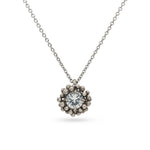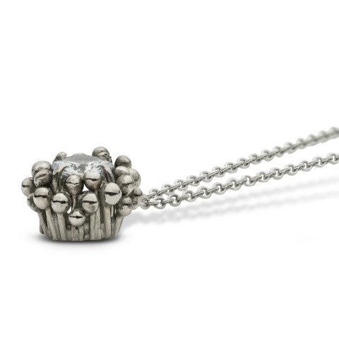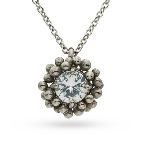 This white gold white sapphire pendant necklace features a beautiful sparkling sapphire wrapped molecules. A luxurious piece that can be enjoyed everyday. Each stem is individuality handmade to form this unique setting.