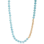 This necklace is about balance, between colour, texture, and simplicity. The gold brings quiet contrast to the cool stones, without overpowering their natural beauty. This version of the necklace features smaller aquamarine beads, giving it a finer, more delicate feel.