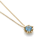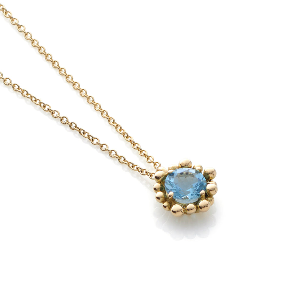 An aquamarine set in a cluster of 9ct yellow gold molecules. A delicate contemporary pendant, designed to complement any outfit.