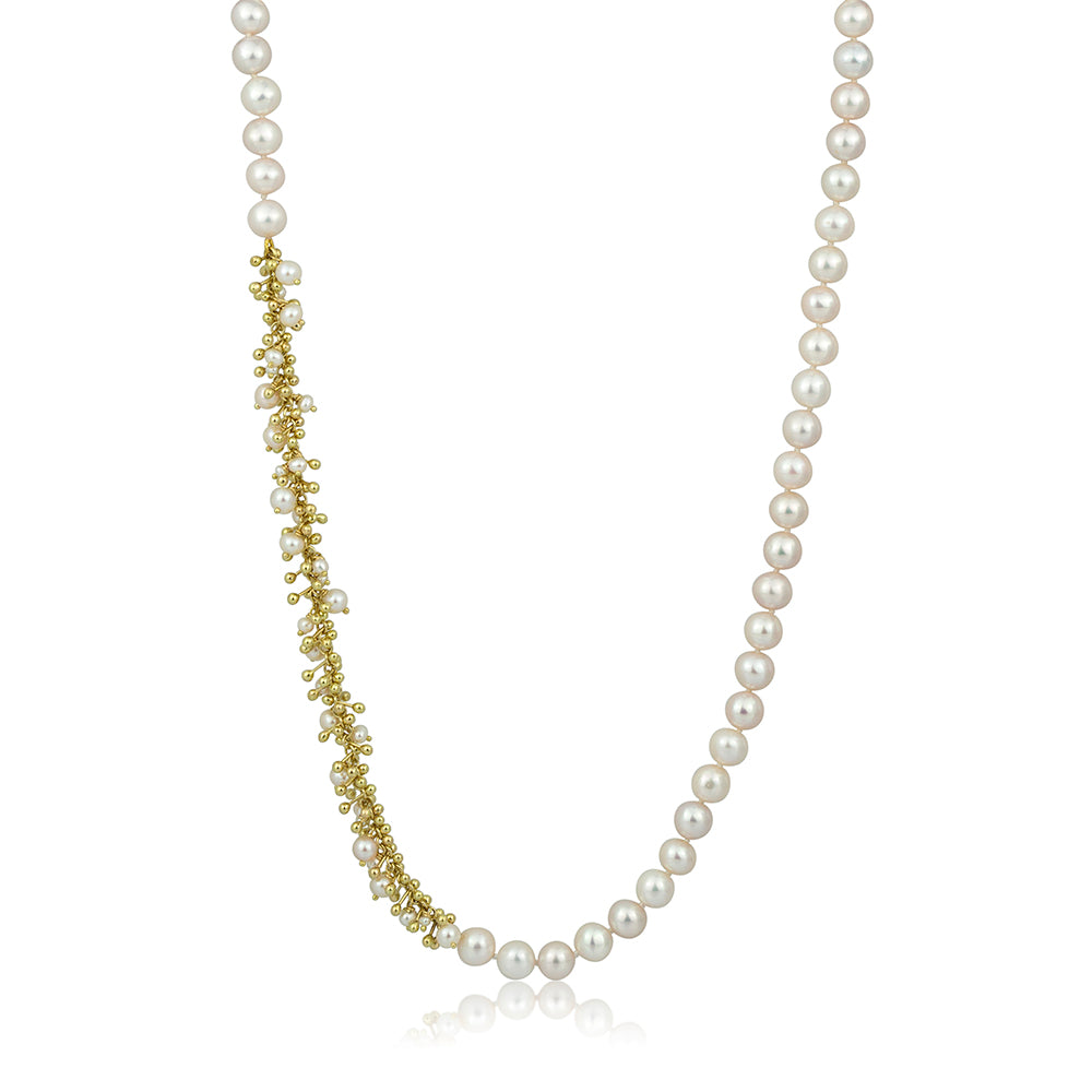 Introducing our freshwater pearl necklace adorned with delicate gold elements, intricately entwined with smaller pearls to add interest to a captivating design. Embrace the blend of modern and timeless style in this sophisticated piece. One-of-a-kind.