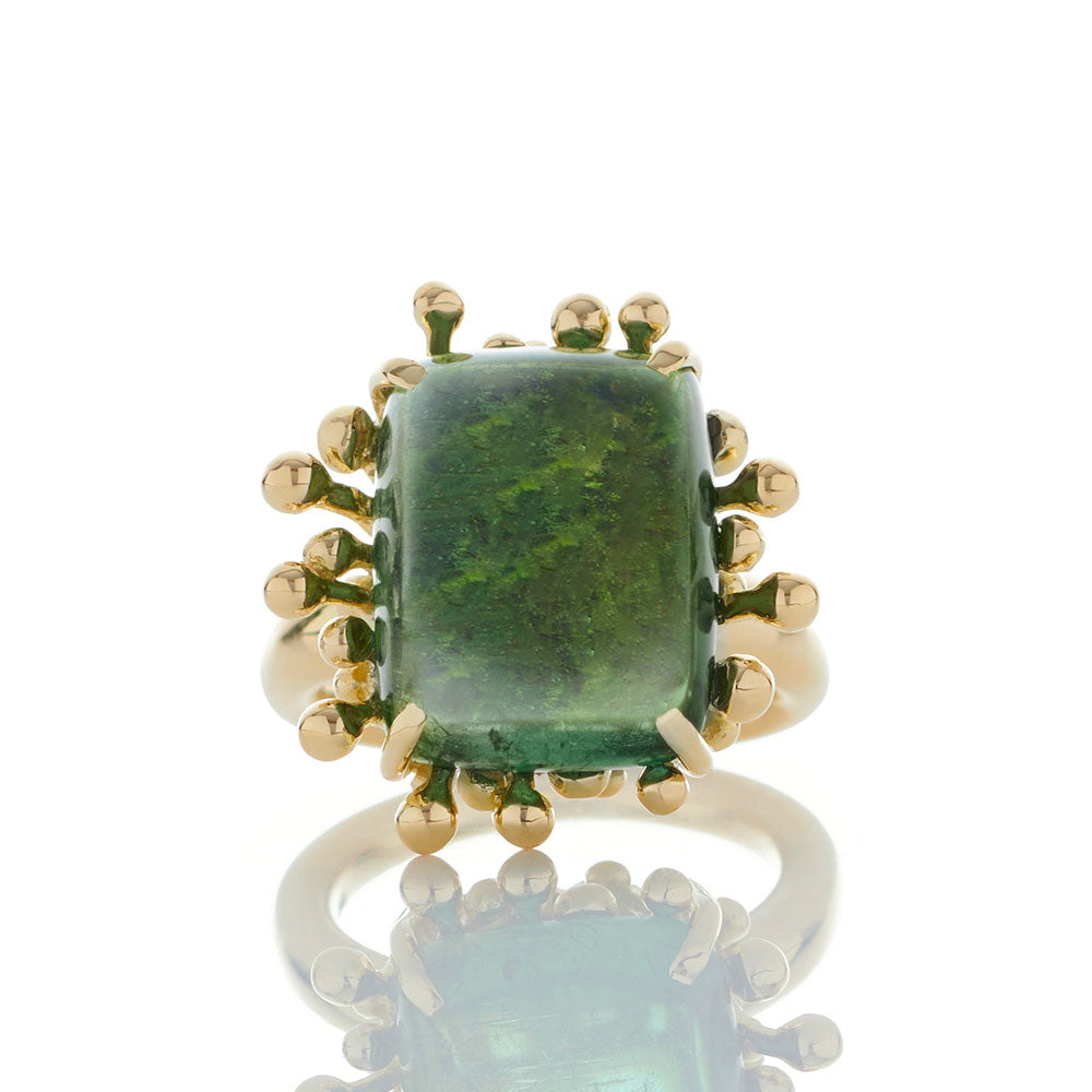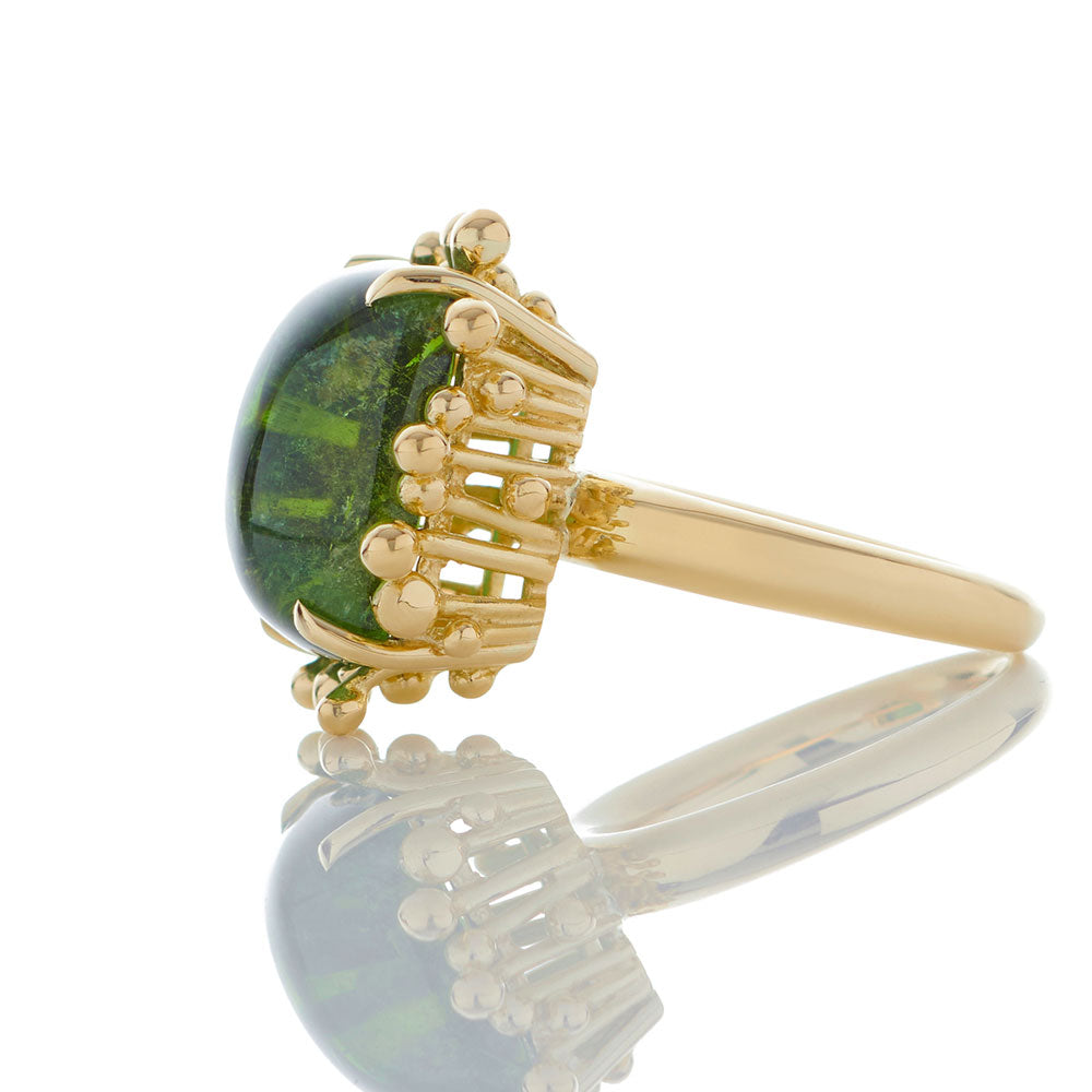 A sculptural setting cradling a lush tourmaline to create a dramatic handcrafted statement ring.