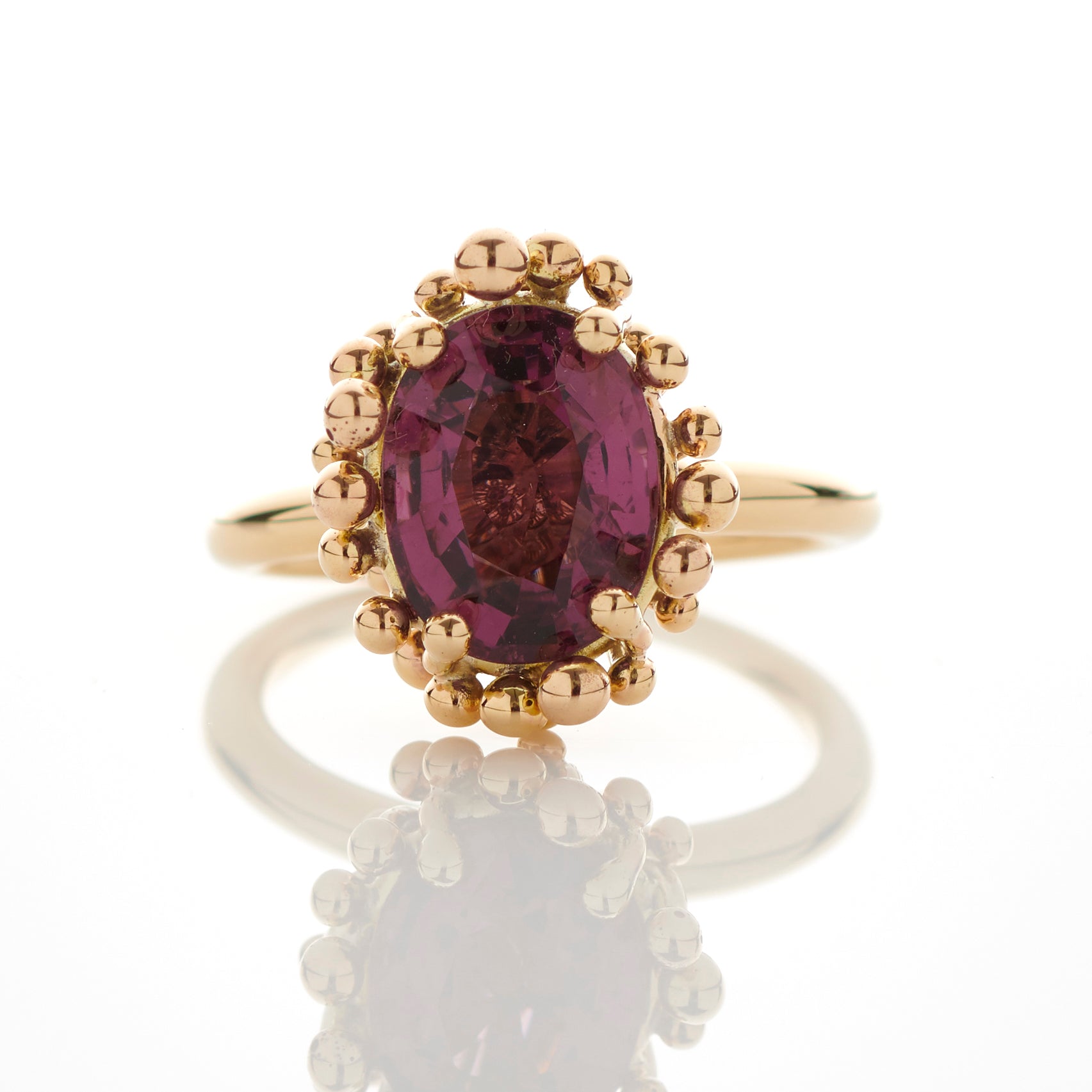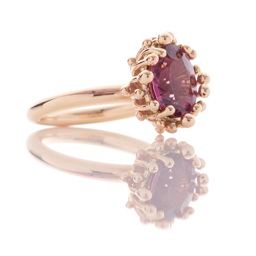A sculptural setting cradling a lush Spinel creating an elegant handcrafted statement ring.