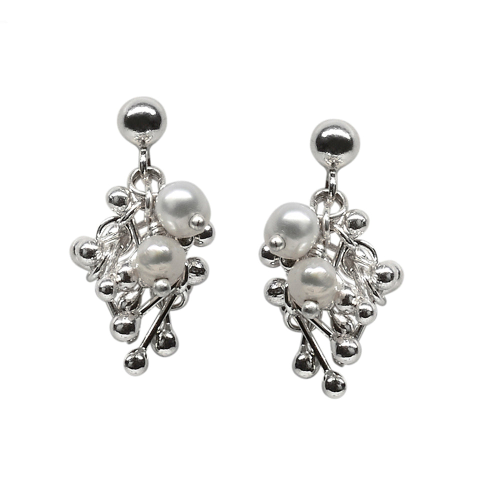 A delicate pair of silver and pearl earrings that are light and refined. The earrings have two freshwater pearls nestled into each cluster.  Suited for all occasions, making for the perfect gift as they combine versatility with distinctive design.