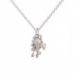 Model wears a delicate cluster of silver and freshwater pearls. Hangs from a chain. Handmade by Yen Jewellery