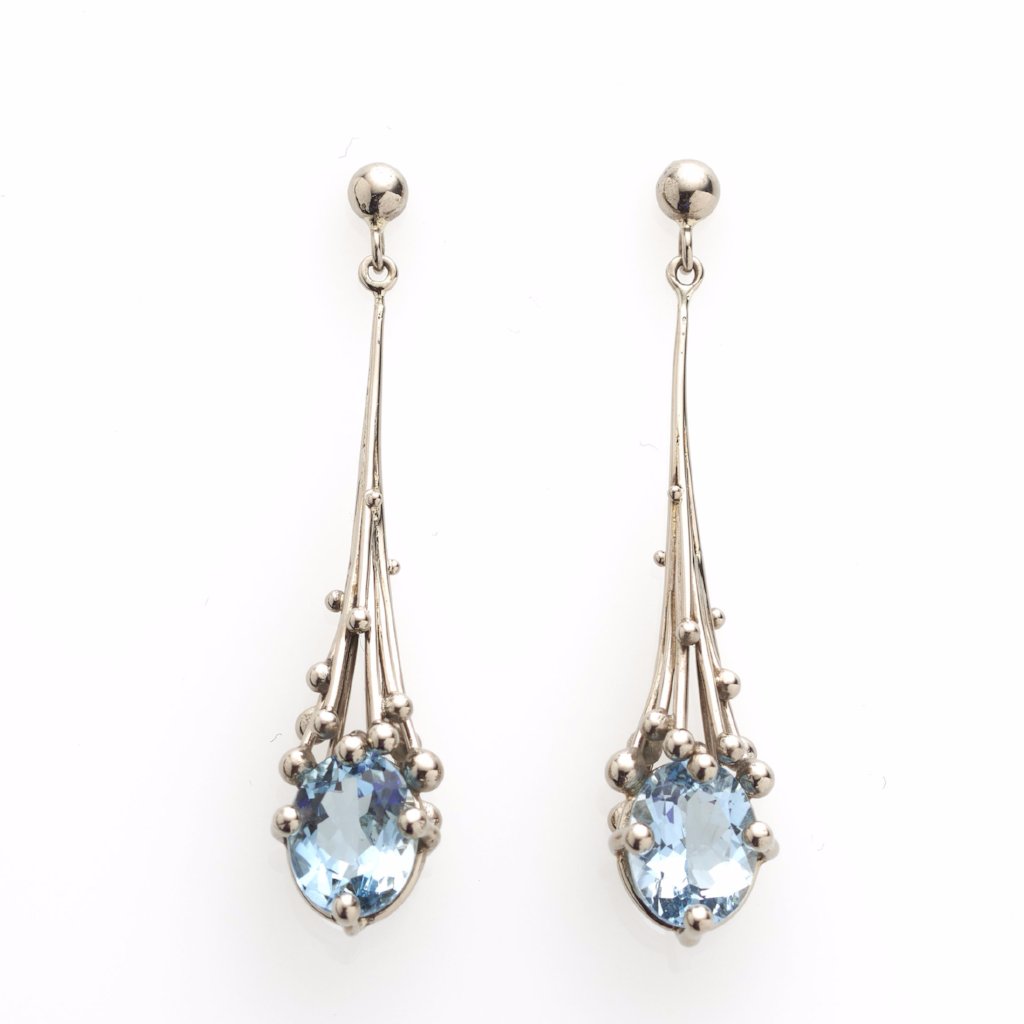 Precious droplets of aquamarine are suspended from sculptural white gold molecule stem settings in these beautiful earrings. Pair with our Aquamarine Drop Pendant for pure elegance.