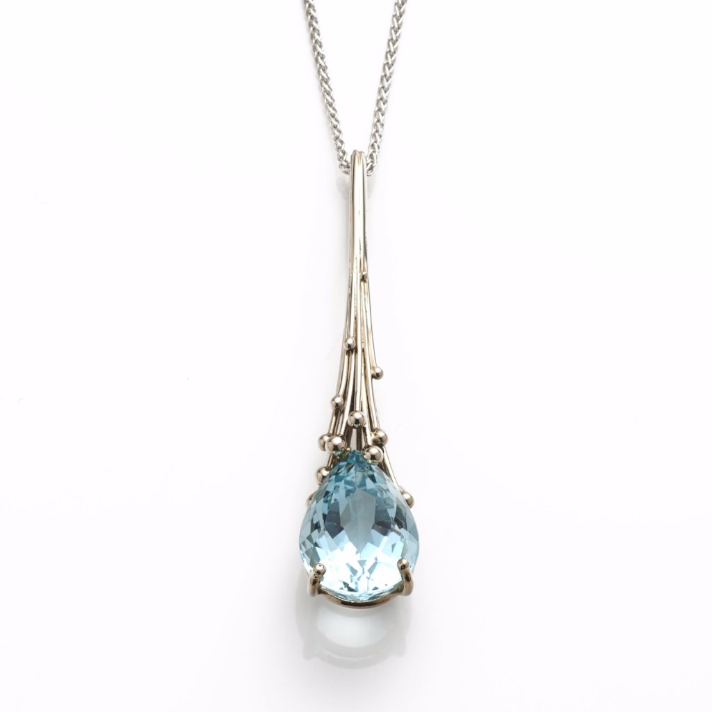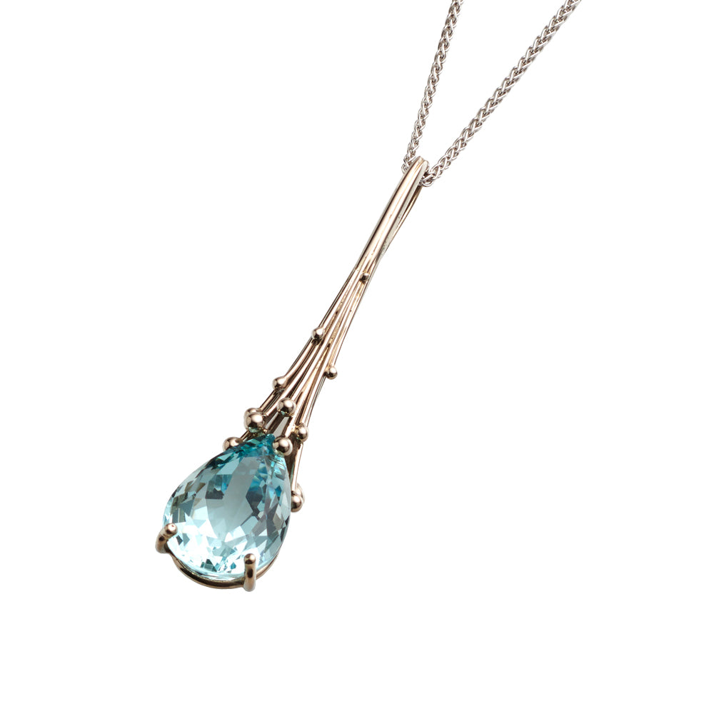 A beautiful droplet of aquamarine is suspended from a sculptural white gold molecule stems setting. Pair with our Aquamarine Drop Earrings for pure elegance.