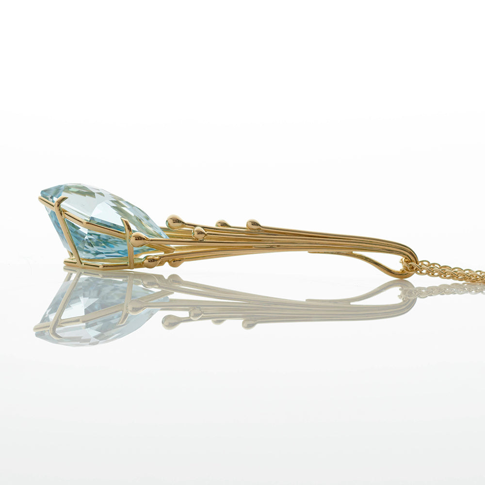 A dynamic linear construction for this flawless aquamarine pendant, gem cutting by Mark Nuell. This sleek, contoured, molecular setting was formed layer by layer to showcase the magnificent freeform aquamarine.