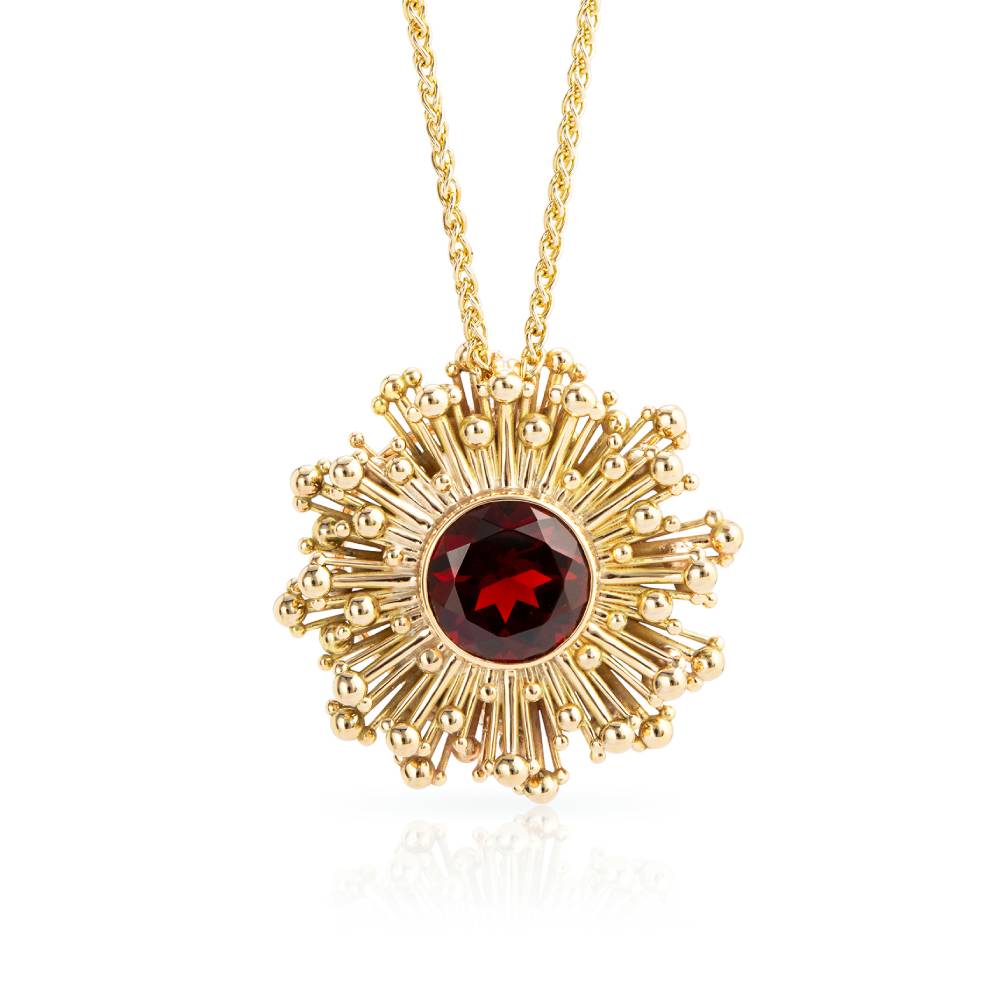 A stunning brooch with an enchanting garnet at its heart. Radiating outward, an intricate burst of sculpted gold elements forms a celestial silhouette, evoking the brilliance and energy of a starburst. Bold yet elegant, this striking piece captures the light beautifully and can also be worn as a pendant for added versatility.