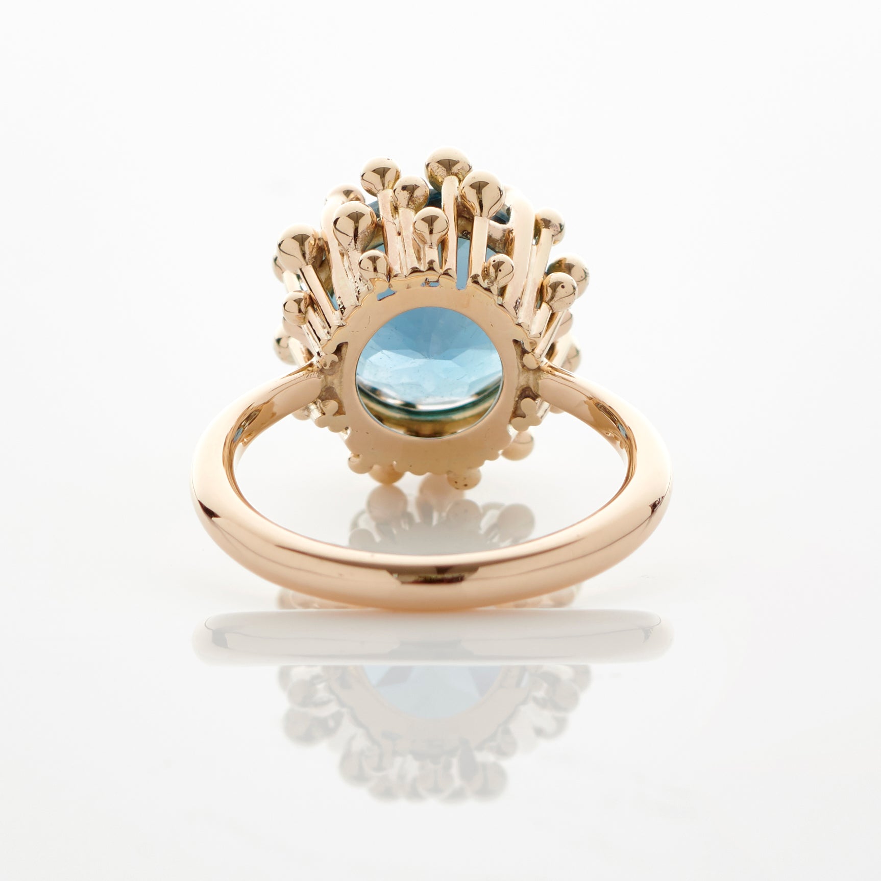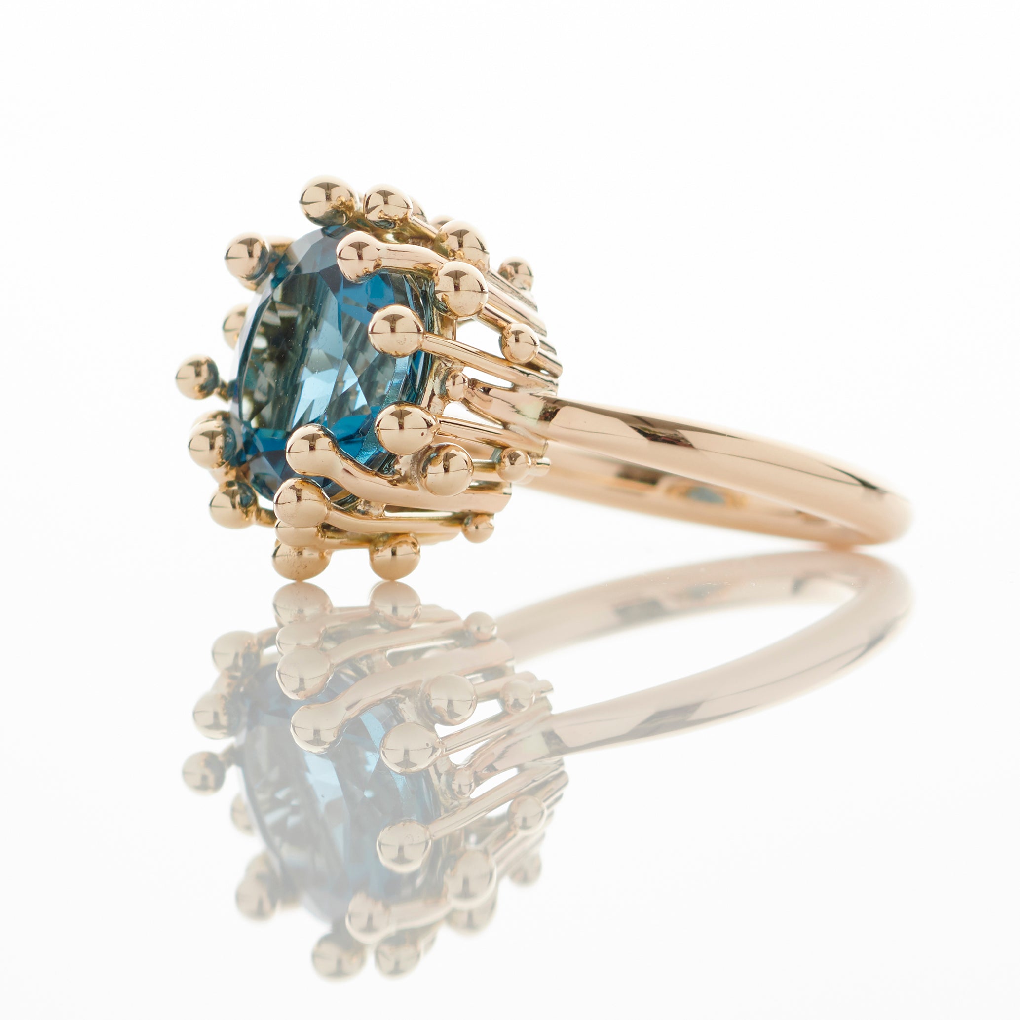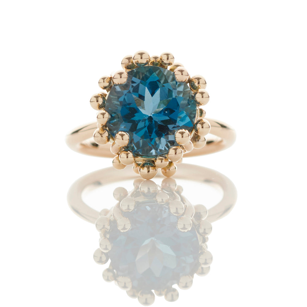 A sculptural gold london blue topaz ring. Each handcrafted molecule detail that surrounds the gemstone complements the claw setting.