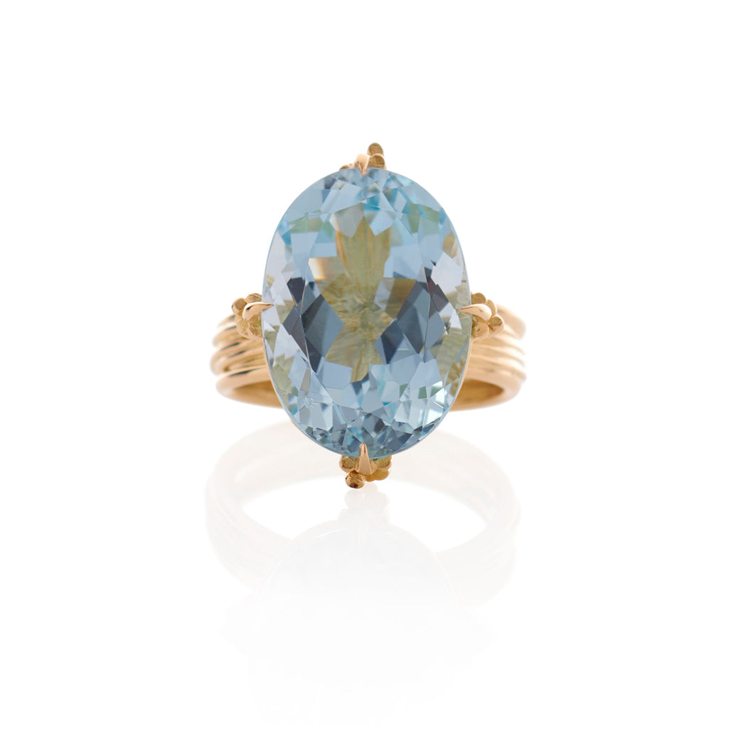 A statement oval aquamarine set in our layered texture gold ring.