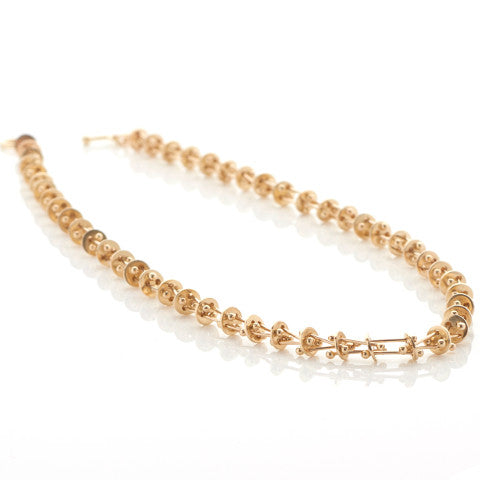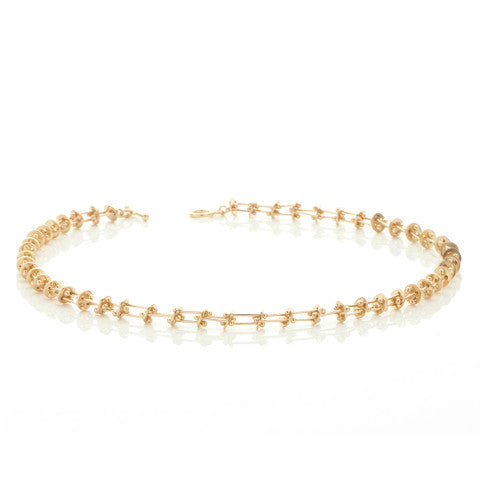 Golden disks are connected by Yen's signature Molecular strands to form this truly unique and contemporary necklace, designed to comfortably contour the necklace line.