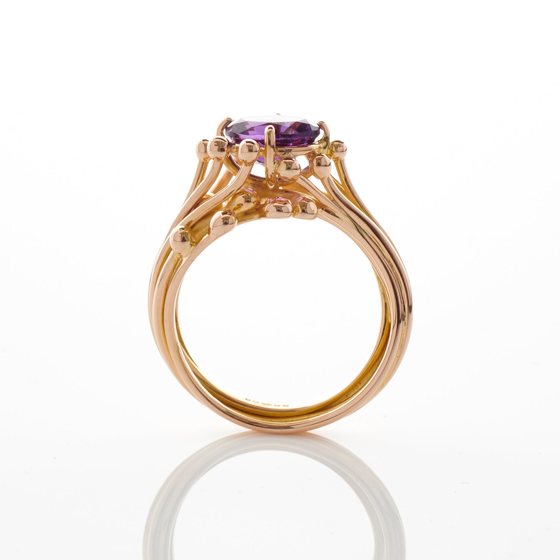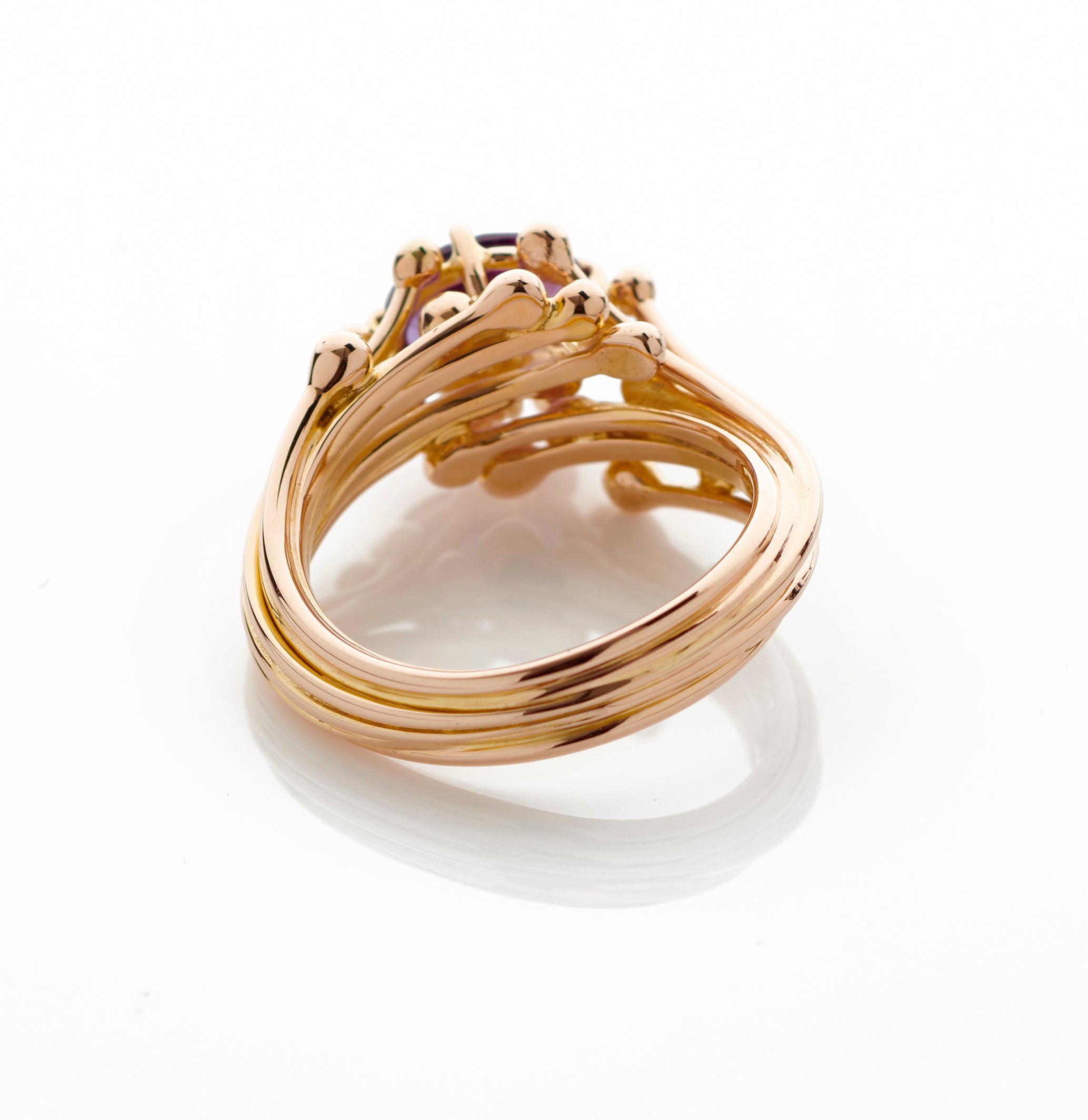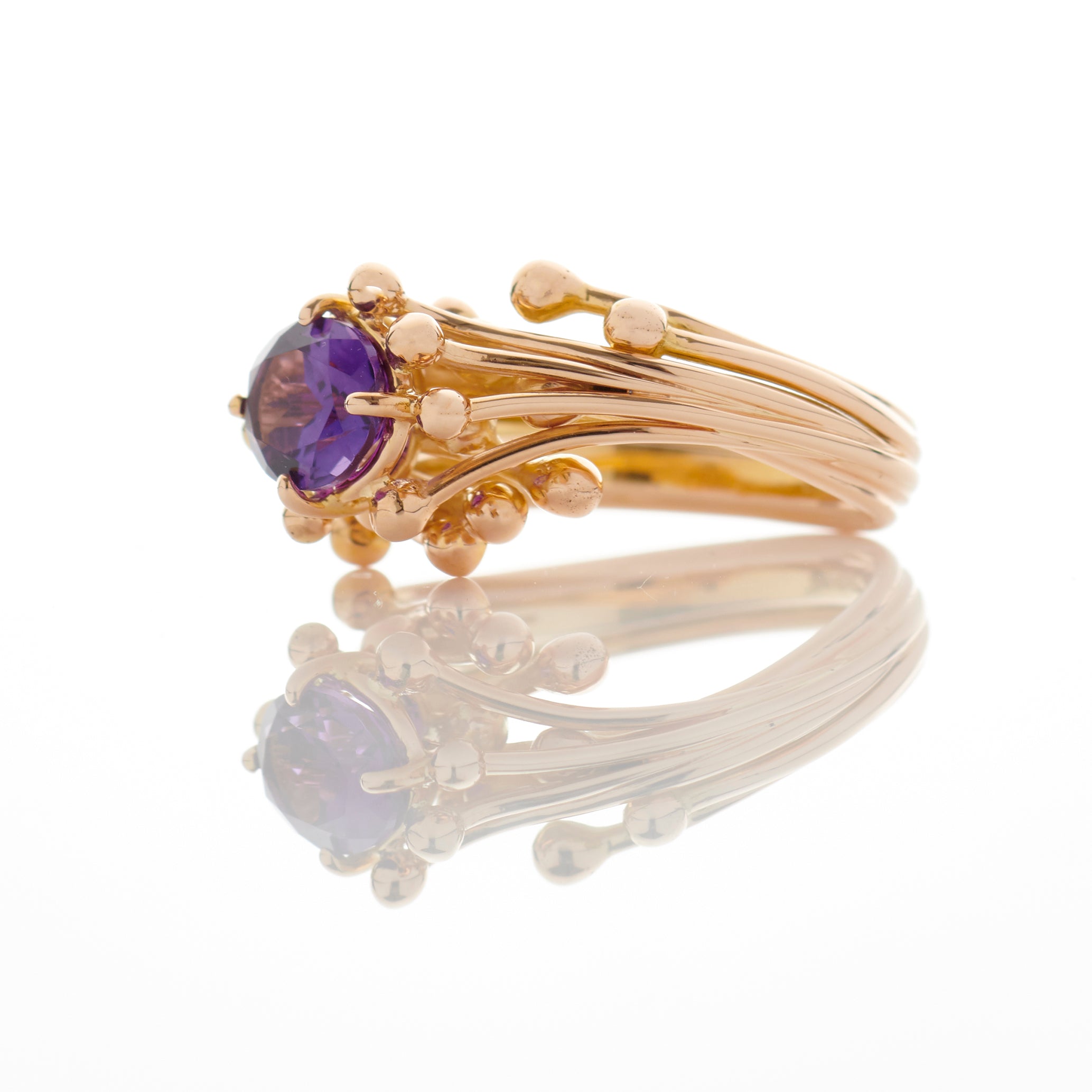 A sculptural setting of 18 ct rose gold with a dramatic amethyst. Each molecule detail that surrounds the gemstone complements the claw setting. A  handcrafted contemporary statement piece.