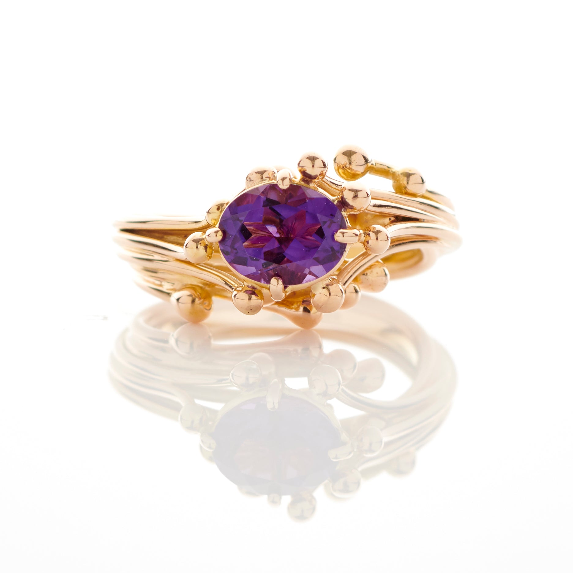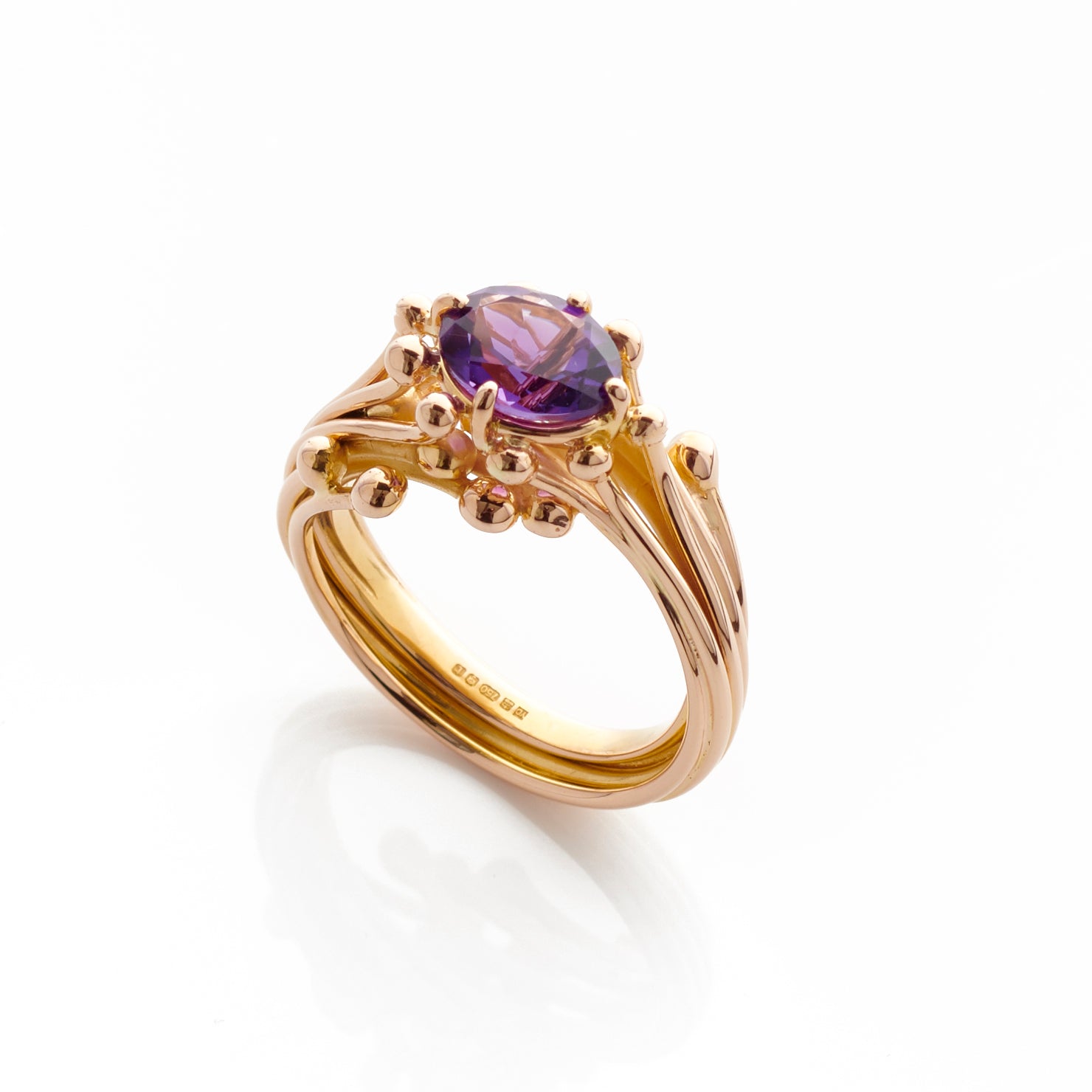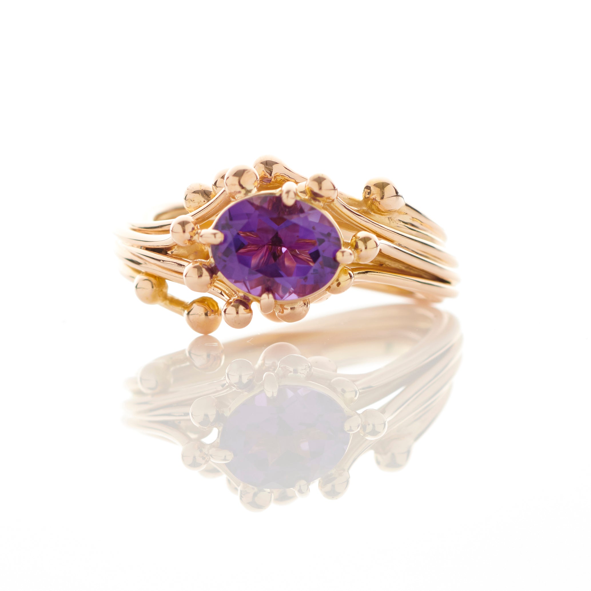A sculptural setting of 18 ct rose gold with a dramatic amethyst. Each molecule detail that surrounds the gemstone complements the claw setting. A  handcrafted contemporary statement piece.