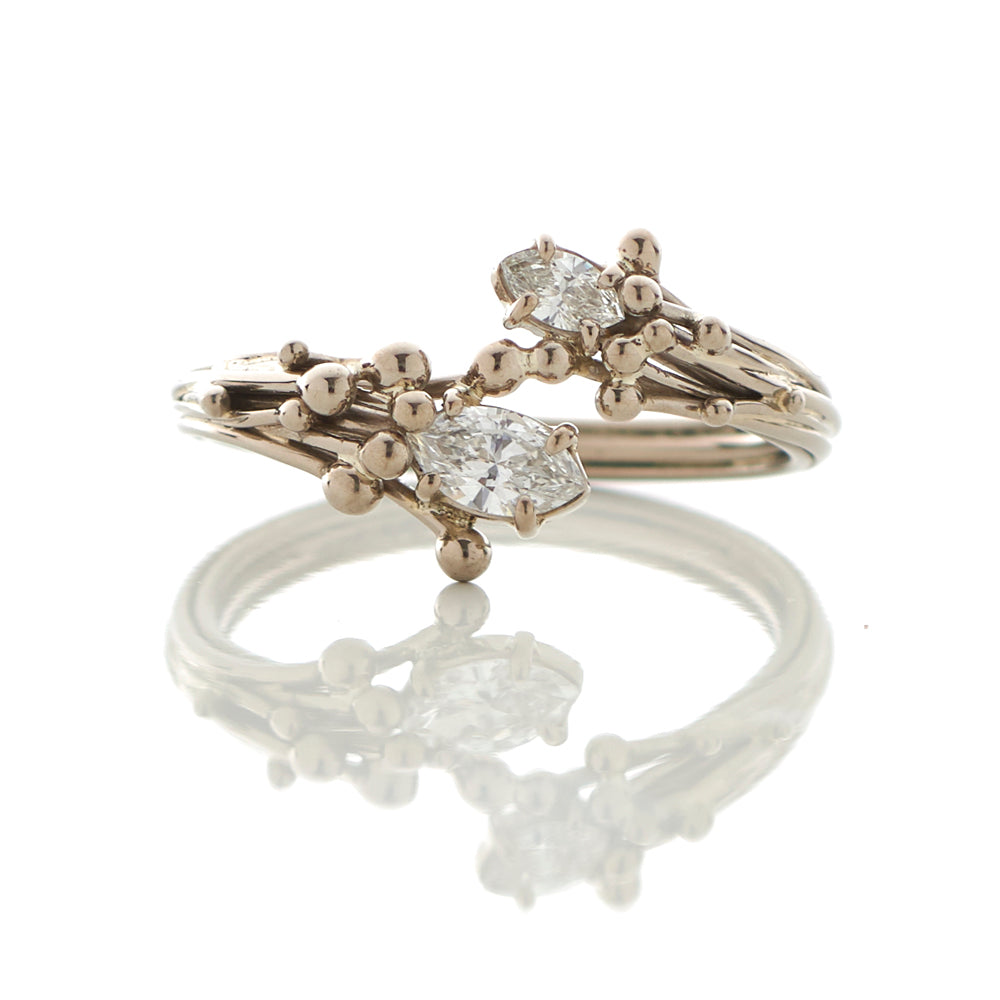 An elegant 18ct white gold ring with two marquise diamonds. A sweeping handcrafted setting encasing brilliant cut diamonds.